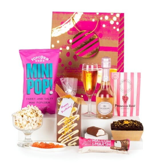 Celebrate any birthday in style with Birthday Bliss, a charming gift bag filled with sweet surprises. Inside awaits a mini Robert & Reeves Prosecco, crunchy Popcorn Shed Mini Pop!, a rich Stas Milk Chocolate Bar, and a British Bakes & Cakes Raspberry & White Chocolate Mini Loaf Cake. Finished with Ask Mummy & Daddy Big Kisses Sweets and a classic Bramble Foods Cherry Bakewell Flapjack, it’s the perfect pick-me-up to make their day extra special. This hamper contains 6 items: Bramble Foods Cherry Bakewell Flapjack 80g British Bakes & Cakes Raspberry & White Chocolate Mini Loaf Cake 90g Popcorn Shed Mini Pop! Sweet and Salty 28g Stas Decorated Milk Chocolate Bar 100g Ask Mummy & Daddy Big Kisses 50g Prosecco R&R Robert & Reeves Italy 20cl 10.5% vol Packed in a gift bag.