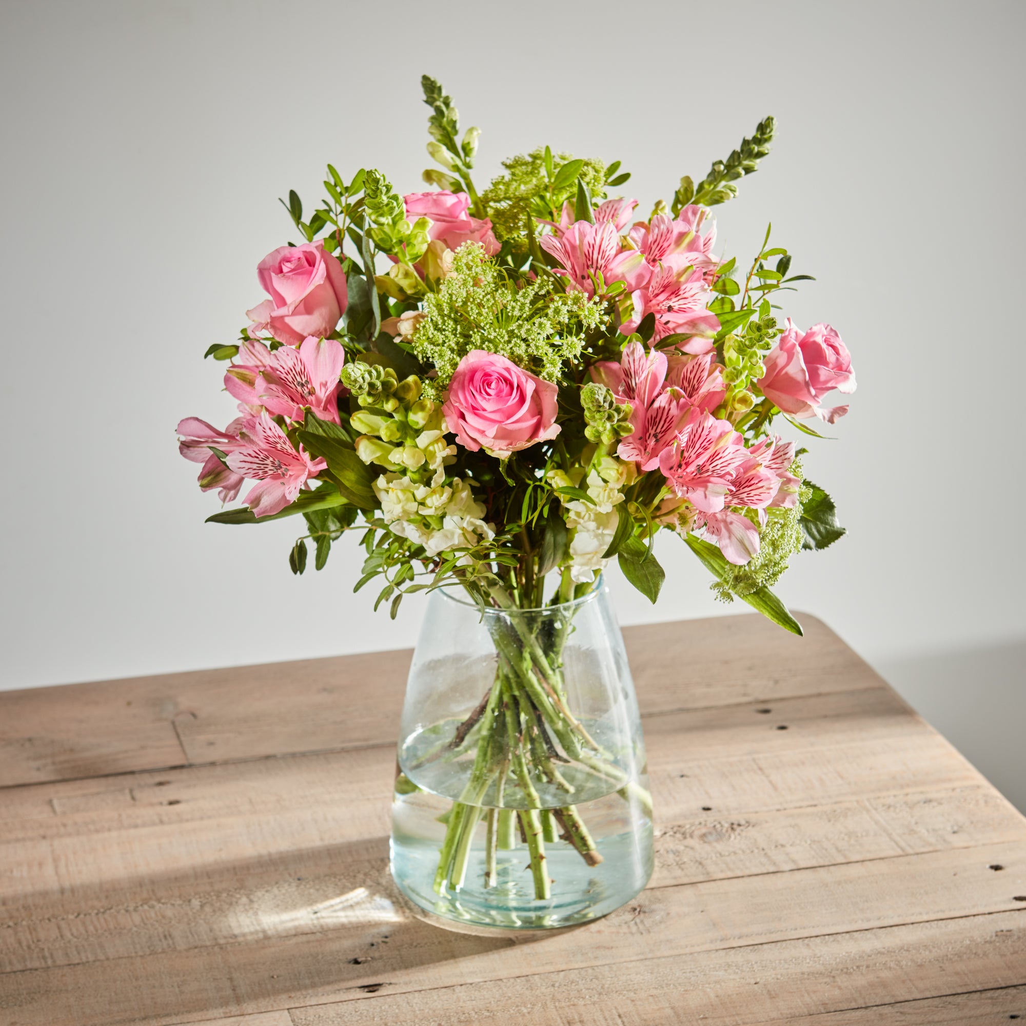 This beautiful arrangement takes us to pink paradise! Pretty antirrhinum, alstroemeria and rose aqua offer sweet pale pink hues and are paired perfectly with lacey clusters of white ammi majus and aster. A stunning bouquet and gift to send for any occasion.
