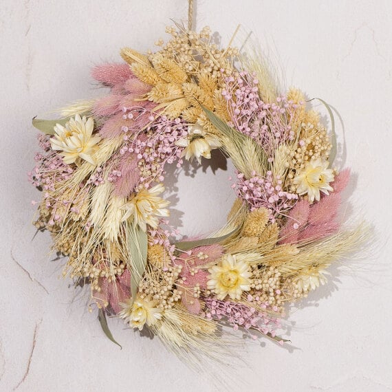 This pastel wreath of dried wildflowers and bunny tails will be a perfect centrepiece in any room. Dried flowers are ideal for long-lasting displays and are a sensational and sustainable gift for any occasion. Measures approximately: 20cm.