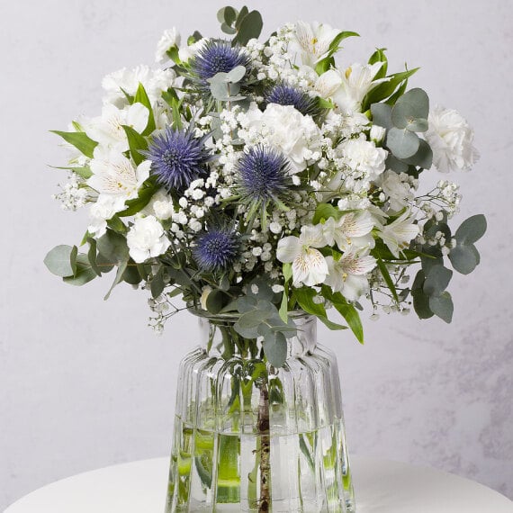 This classic bouquet showcases the beauty of these elegant flowers. The striking blue Thistles provide a stunning contrast to the snow-white Carnations and Alstroemeria, creating a harmonious blend of colours. The lush Eucalyptus leaves interspersed throughout the flowers add a beautiful finishing touch to the bouquet.