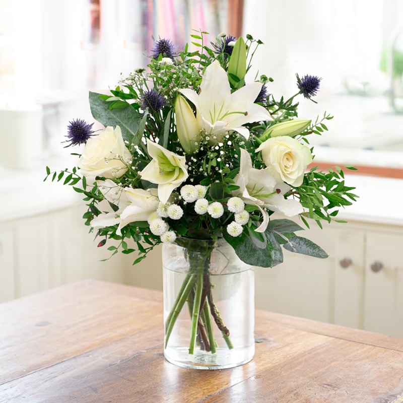 A stunning bouquet of sky blue Veronica with white Athena roses.