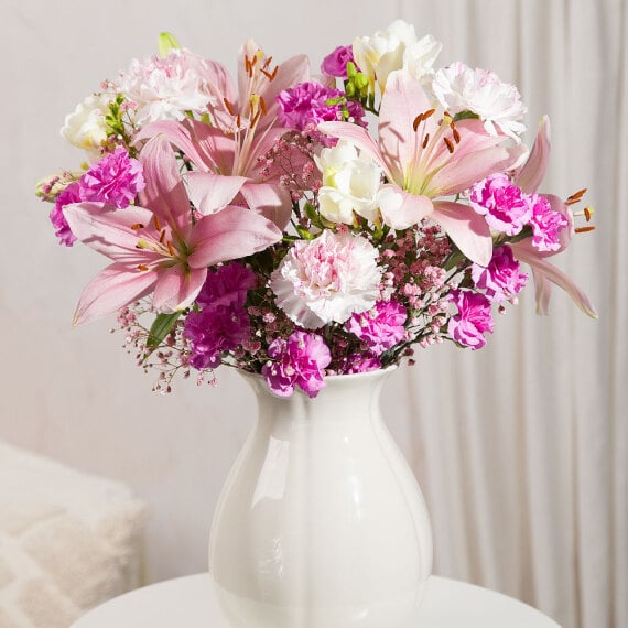 A feminine selection of pale pink Asiatic Lilies alongside hot pink spray Carnations, pink and white two tone Carnations and white Freesias. Beautifully finished with sweet pink Gypsophila, it will make a gorgeous gift to send for any special occasion.