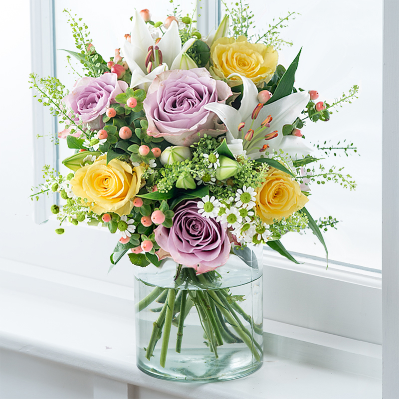 A beautiful bouquet of luxury flowers is the perfect gift from Blossoming Gifts, the prestigious online florist. Pure white fragrant oriental lilies with vibrant yellow roses, sugar flair hypericum berries and alluring lilac nightingale roses. The bouquet pictured is the Large size.