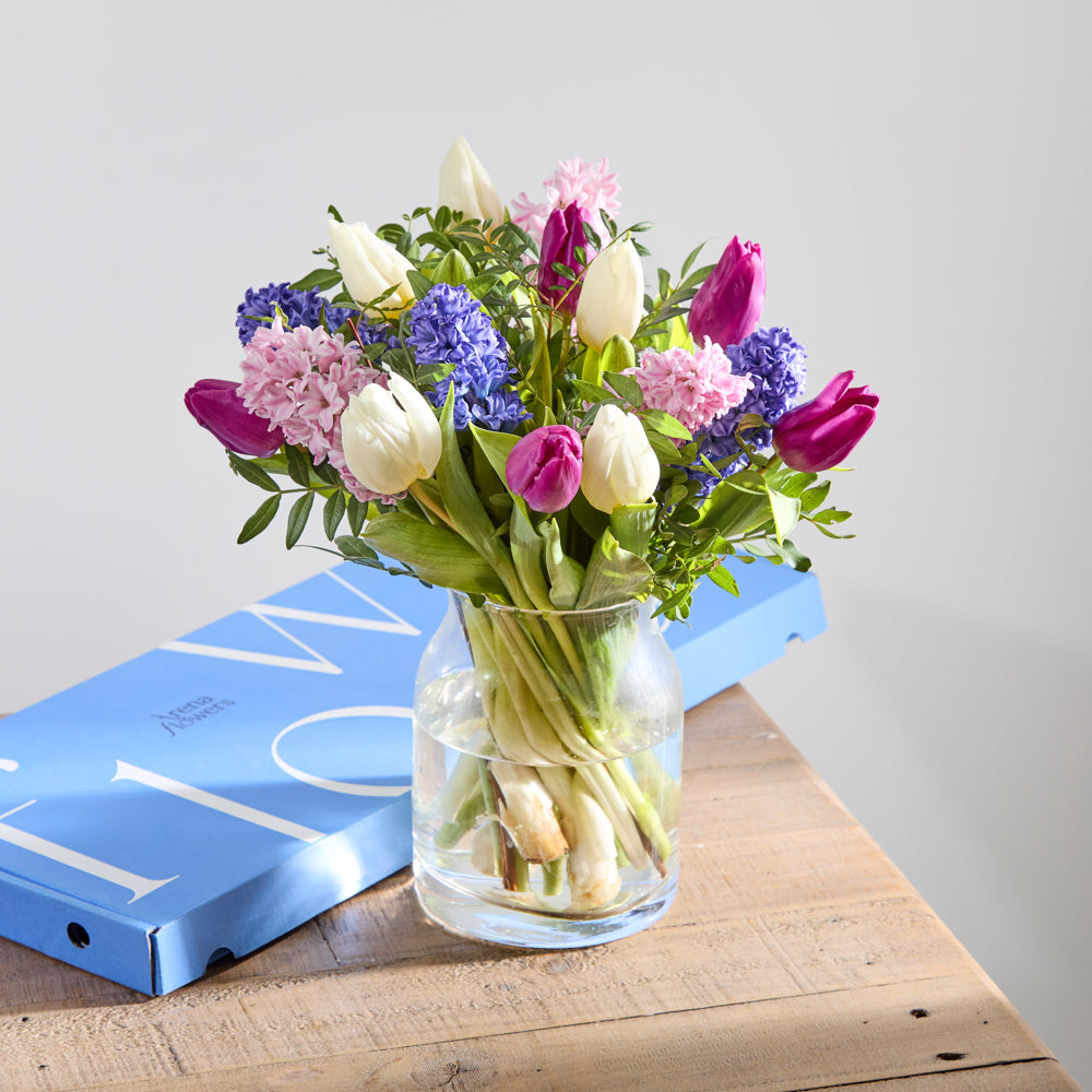Surprise your loved one with a Spring bouquet of seasonal flowers in jewel tones. Featuring white and jurple tulips, and pink and blue hyacinths, it’s a delightful gift to give and receive. Order by 9pm for next-day delivery.