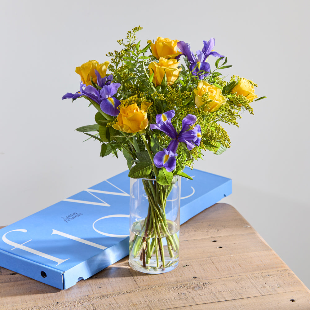 Send sunshine to their door with these uplifting letterbox flowers, featuring yellow and pink roses, blue irises and golden solidago. The ultimate mood-boosting gift, available with next-day delivery.