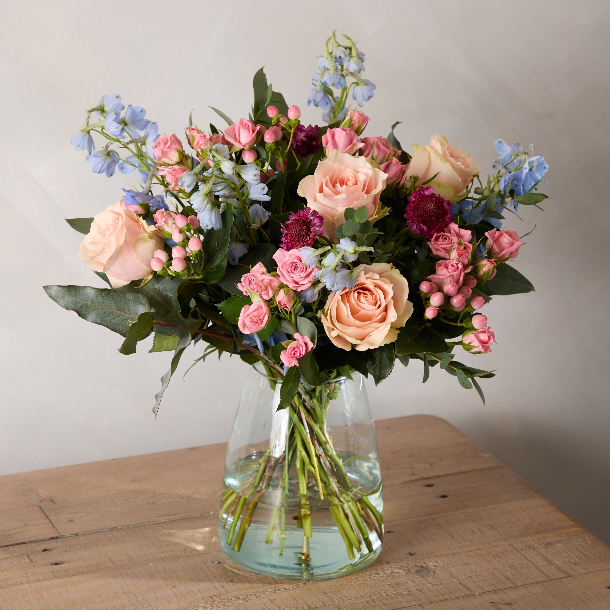 Bringing peace and serenity, this bouquet of blue delphiniums and pink roses makes for a calming gift this Spring. Send today, with UK-wide delivery.