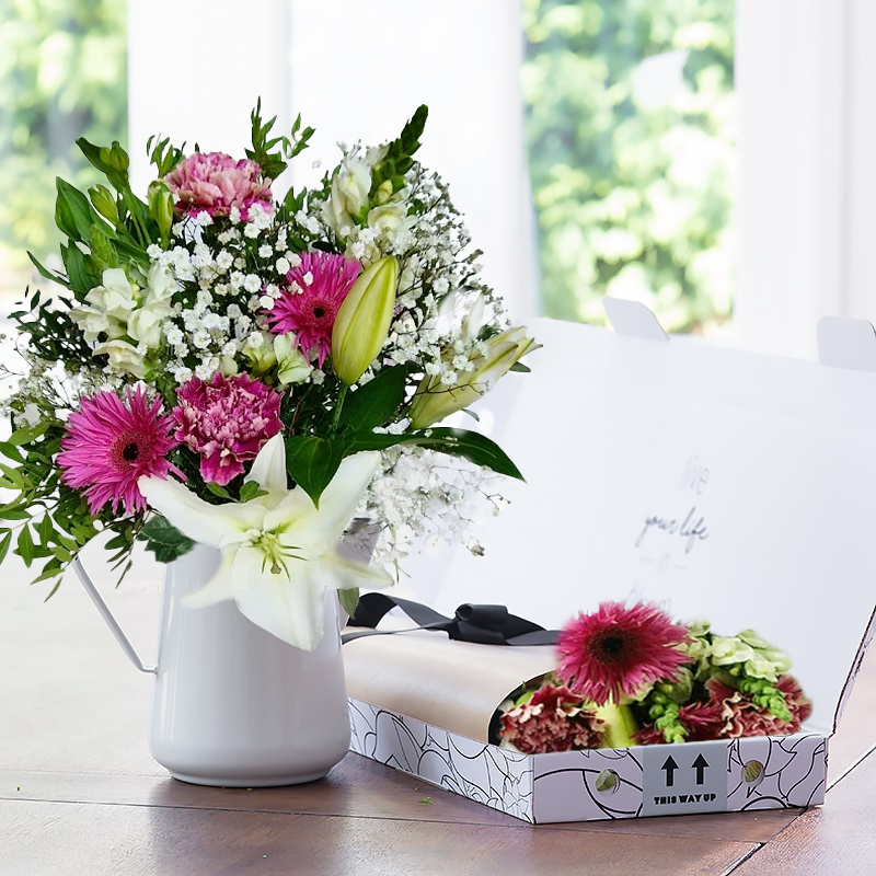Enjoy the sweet charm of this lovely bouquet, featuring soft pink carnations, white lilies, and alstroemeria. A simple yet beautiful way to brighten any space.