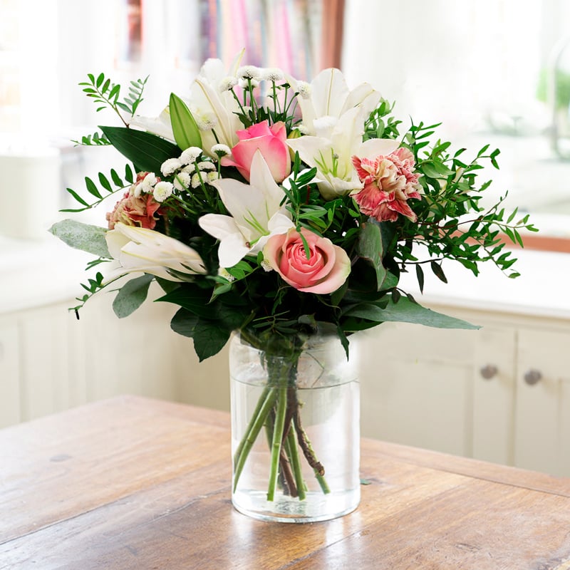 This beautiful bouquet of hand-tied flowers is a floral delight of pretty pink athena roses, heavenly scented white lilies and vibrant eucalyptus with green bell.