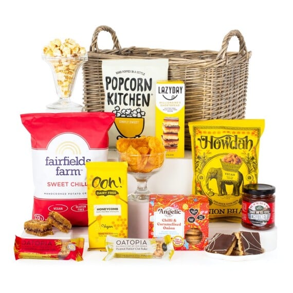 Our Proudly Vegan gift basket is packed with plant-based indulgence, from Angelic Cookies and Lazy Day Rocky Road to Ooh! Chocolata Vegan Chocolate, Howdah Poppadoms and Olly’s Olives. Beautifully presented in a black rope basket, it’s the perfect vegan-friendly gift for any occasion. This hamper contains 8 items: Angelic Double Chocolate Cookies 125g Angelic Multi Seed Savoury Biscuits 142g Howdah Tandoor BBQ Poppadom Minis 80g Lazy Day Rocky Road 150g Melting Pot Vegan Honeycomb Fudge 90g Olly’s Multi-Seed Sesame Pretzel Thins 35g Olly’s Olives Chilli and Rosemary Green Olives 50g Ooh! Chocolata Dairy Free & Vegan Honeycomb Milk Chocolate 50g Packed in a rope weave basket.