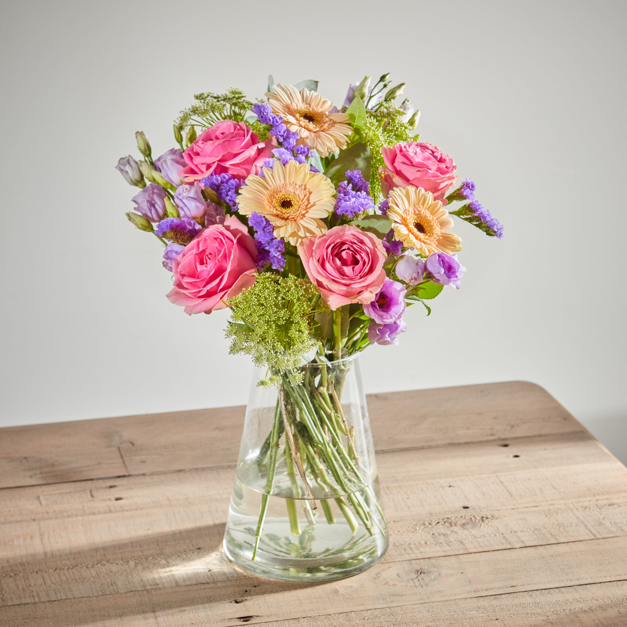 Let them know they’re in your thoughts with ‘Quiet Solace’. This tender arrangement features cream germini, embodying hope, alongside soft pink roses, a classic symbol of grace and admiration. Lilac tones add serene beauty, creating a bouquet that is both soothing and visually striking.