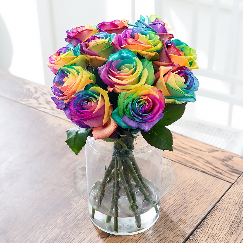Enjoy this unique bouquet of multicoloured rainbow roses, each bloom is perfectly dyed to create an abundance of colour. Imagine the amazement when your recipient opens the box to this splash of vibrancy, beautifully displaying all the colours of the rainbow.Order this one-of-a-kind bouquet today with Blossoming Gifts, an extraordinary gift they will always remember. Shop our rainbow flowers online now. Please note due to the dyeing process of these flowers the colour may vary in pigment. The bouquet pictured is the 12 Roses size.”Brings a burst of vibrant colour to any room”