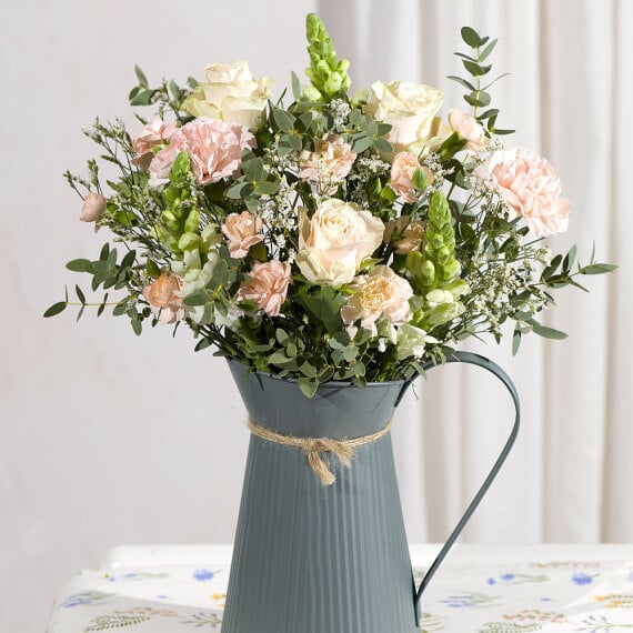 An elegant collection of peach Roses and Carnations with complementing white Snapdragon. White Limonium and green Ruscus foliage complete this luxurious display.