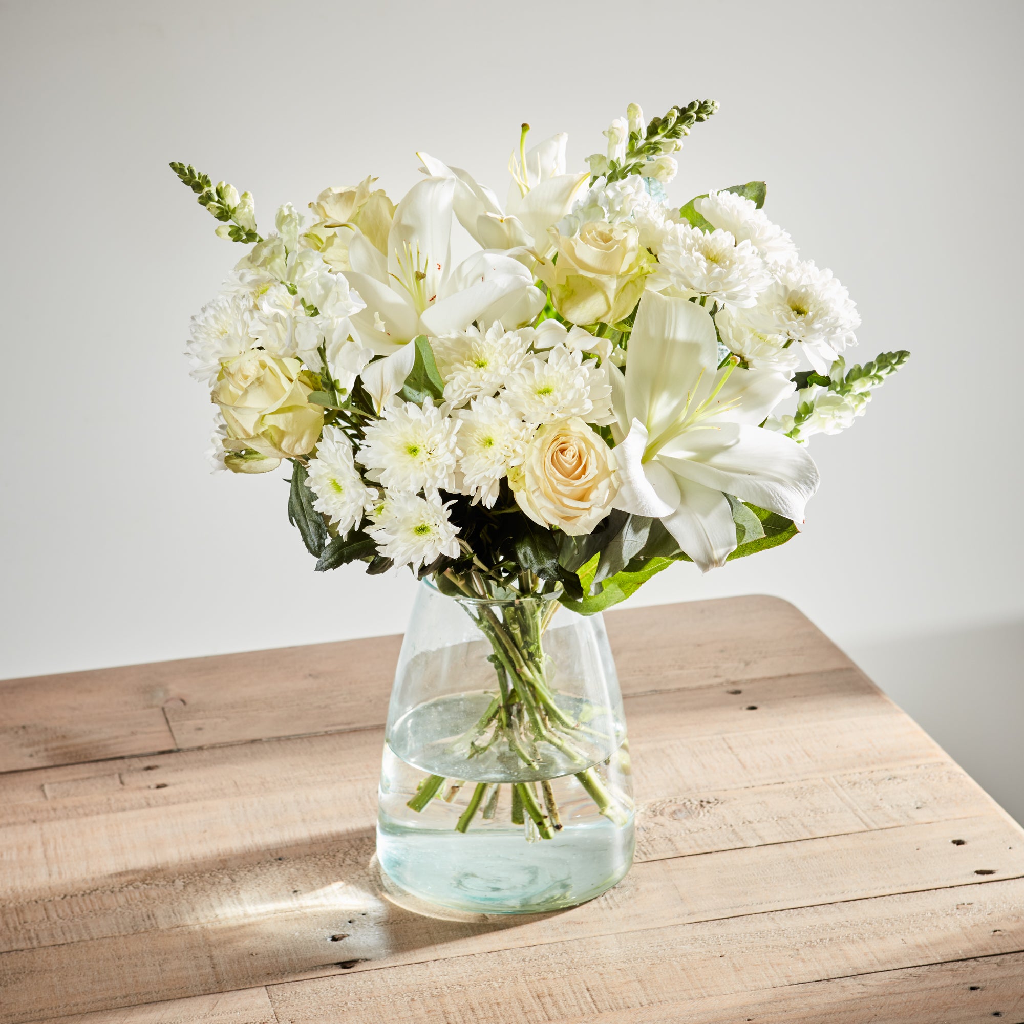 A welcome moment of peace in the noise of the day. The ‘Serene Splendour’ bouquet offers just that. Pure white Oriental lilies with the innocence of white roses are the epitome of grace. Complementing these are white chrysanthemums, embodying loyalty and devotion. ‘Serene Splendour’ is an ode to calm and serene love.