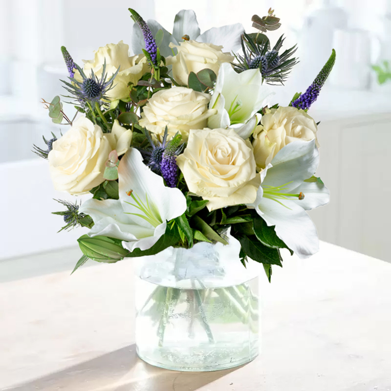 A delicate bouquet of creamy Athena roses and white lilies, finished with blue veronica and eryngium. A beautiful and elegant gift for any occasion.