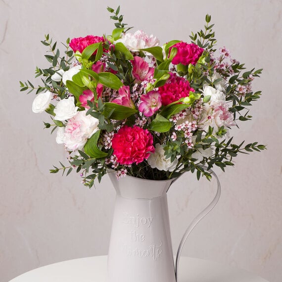 An elegant selection of classic pink and white Carnations and pollen-free pink ‘Florinca’ Alstroemeria. Paired with delicate clusters of pink Wax Flower and lush Parvi Eucalyptus foliage, this bouquet radiates charm and beauty.