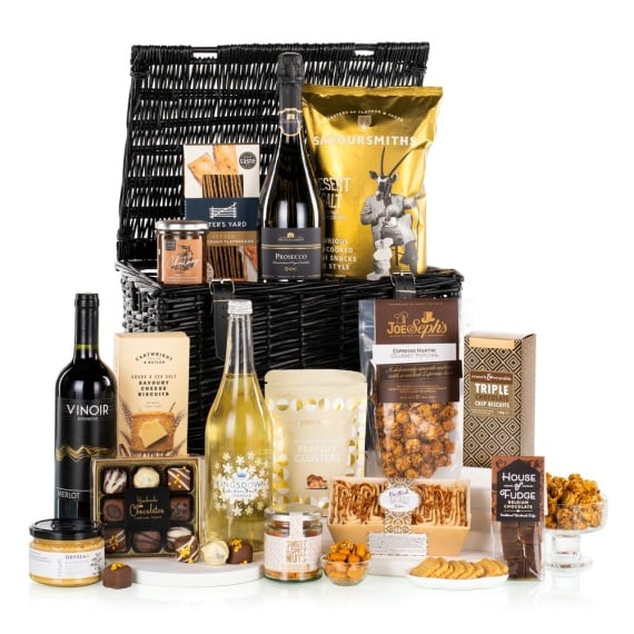 A truly show-stopping hamper, The Extravagance combines fine wines, Prosecco and Elderflower Sparkle with gourmet savoury treats and indulgent sweets. Beautifully presented in a black lidded wicker basket, it’s the ultimate luxury gift for any grand occasion. This hamper contains 15 items: British Bakes & Cakes Toffee Loaf Cake 290g Cambrook Sweet & Spicy Nut Mix 75g Cartwright & Butler Gouda & Sea Salt Savoury Cheese Biscuits 75g Crunch & Crumble Triple Chocolate Biscuits 150g Highfield Preserves Real Ale Chutney 215g House of Fudge Belgian Chocolate Fudge 100g Joe & Seph’s Espresso Martini Popcorn 70g Joypouch Peanut Clusters 100g Kingsdown Elderflower Sparkle 750ml Linden Lady 9 Assorted Chocolates 110g Odysea Houmous 265g Peter’s Yard Seeded Flatbreads 135g Savoursmiths Desert Salt Crisps 150g Prosecco DOC Montecampo Italy 75cl 10.5% vol Merlot Vinoir Chile 75cl 12.5% vol Packed in black traditional lidded hamper.